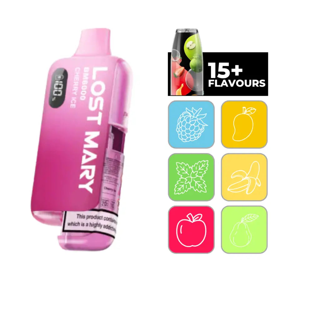 Prepare to ignite your senses and embark on an extraordinary vaping journey with the electrifying Lost Mary BM6000 Cherry Ice! This isn't just a vape; it's an exhilarating passport to flavor nirvana, courtesy of the renowned Lost Mary Vape. Immerse yourself in the vibrant, refreshing taste of crisp cherries, kissed by an arctic blast, creating a symphony of sweet and cool that will leave you craving more. Crafted for the true enthusiast, the Mary BM6000 Cherry Ice stands tall among Big Puff Vapes, delivering an astonishing up to 6000 puffs of unparalleled satisfaction. Fueling this epic endurance is a robust 650mAh rechargeable battery, ensuring your adventure never falters. The secret to its explosive flavor and voluminous vapor production lies within its advanced mesh coils, truly elevating the Big Lost Mary experience. Stay in command with the sleek and intuitive OLED display, providing instant, real-time updates on your battery life and usage. Each inhale delivers a smooth and profoundly satisfying nicotine embrace, thanks to the included 20mg/ml nic salt e-liquid. And the excitement doesn't stop there! The Lost Mary BM6000 Refill invites you to explore an expansive universe of over 15 fruit vape juice flavours, promising endless variety and a personalized journey of taste.