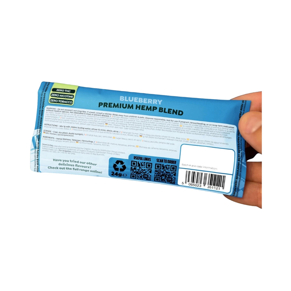 The Professor Herb CBD Hemp Blend (24g) - Blueberry is the UK’s leading nicotine-free herbal substitute, crafted from premium industrial CBD hemp. As a standout in our CBD Hemp Blends collection and featured in our new arrivals, this blend offers a smooth, aromatic experience. Check out our CBD Guide to see why this tobacco-free alternative is a top choice for relaxation.